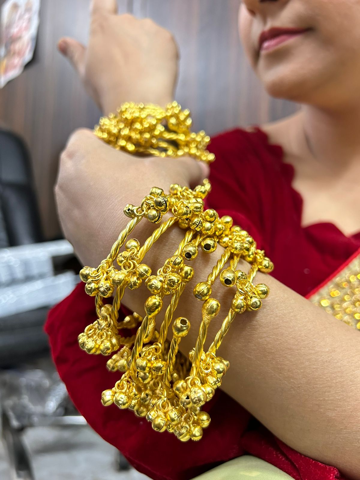 Add timeless elegance and cultural charm to your ethnic look with these traditional Ghungroo Chanchan Bangles. Crafted with intricate detailing, these bangles feature multiple dangling ghungroo-style beads that create a graceful, rhythmic movement with every gesture.